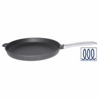 - flache Form, aus handgegossenem Aluminium- Kokillenguss, Antihaftbeschichtung aus Titan- Aluminiumoxyd-Plasma, backofenfest bis +250°C, mit Stiel aus Edelstahl 18/10, hoher Wirkungsgrad auf Induktionsstellen durch Spezialbeschichtung, hochwertiges Qualitätsprodukt